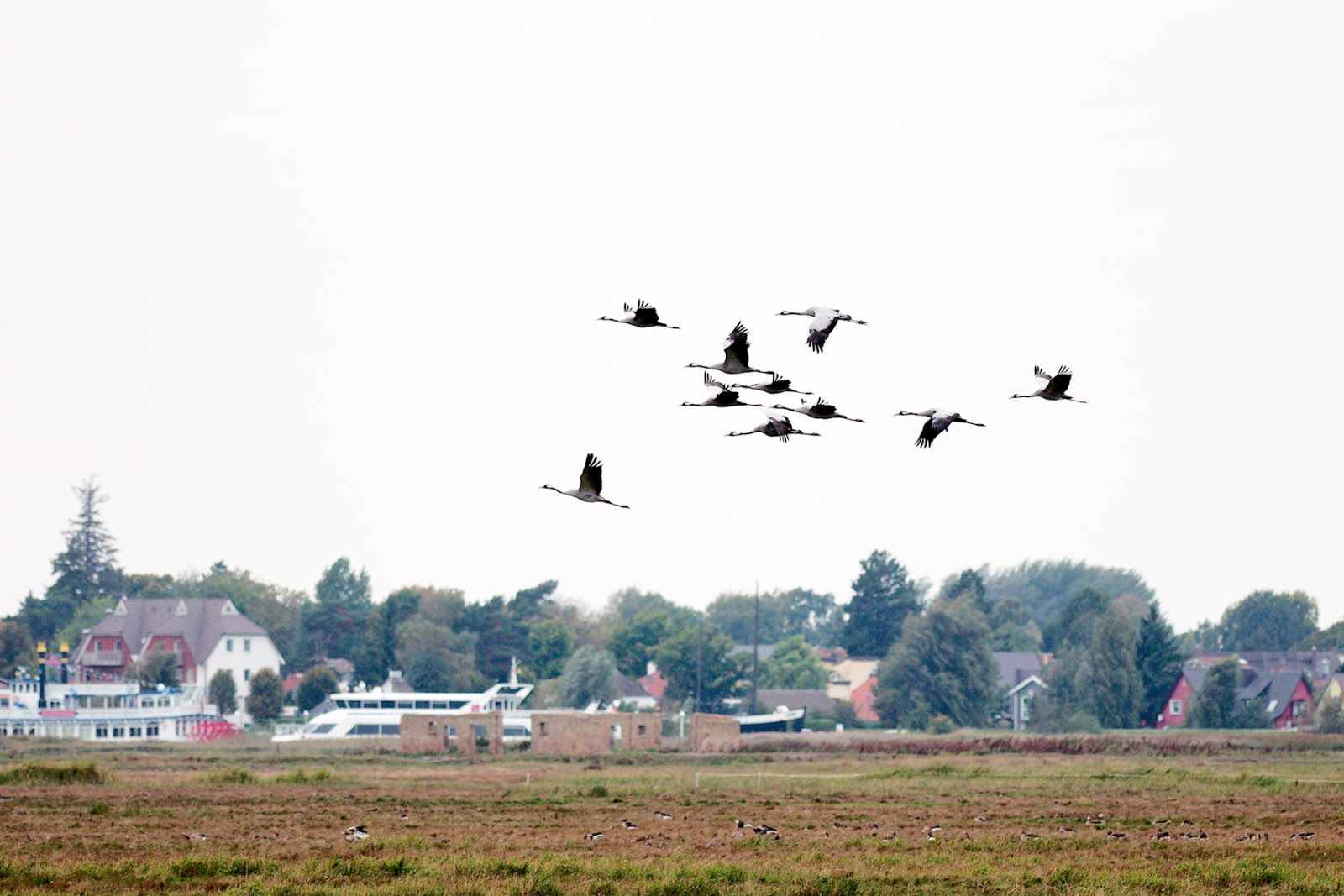 Kraniche fliegen über die Vogelschutzinsel Kirr. Im Hintergrund sind Ausflugsschiffe im Zingster Hafen zu sehen.